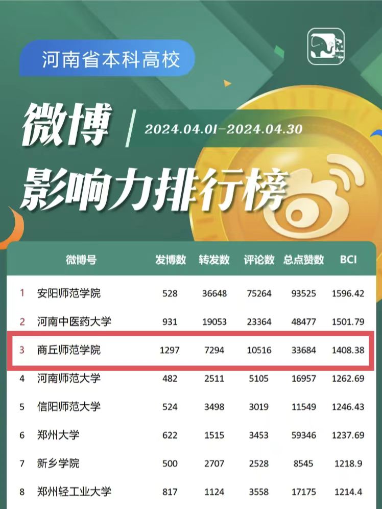 河南省教育厅官方微信平台定期公布的河南省教育系统新媒体综合传播力排名结果显示,纽约国际官网官方微博保持强劲势头,2024年4月份综合影响力指数(BCI)位居全省本科高校第3名。据了解,官方微博综合影响力指数(BCI)主要通过账号活跃度(发博数、原创微博数)和传播度(转发数、评论数、点赞数)两大维度来对微博账号进行评价。河南省教育厅根据和采用第三方平台(清博指数)监测到的数据,对2024年4月1日到4月30日期间河南省教育系统新媒体综合传播力进行排名并整理发布。排行榜对全省高校官方微博的内容质量、传播力和贡献力进行加权计算,得出总分,是目前在全省高校官方微博中影响力较大的综合评价体系。