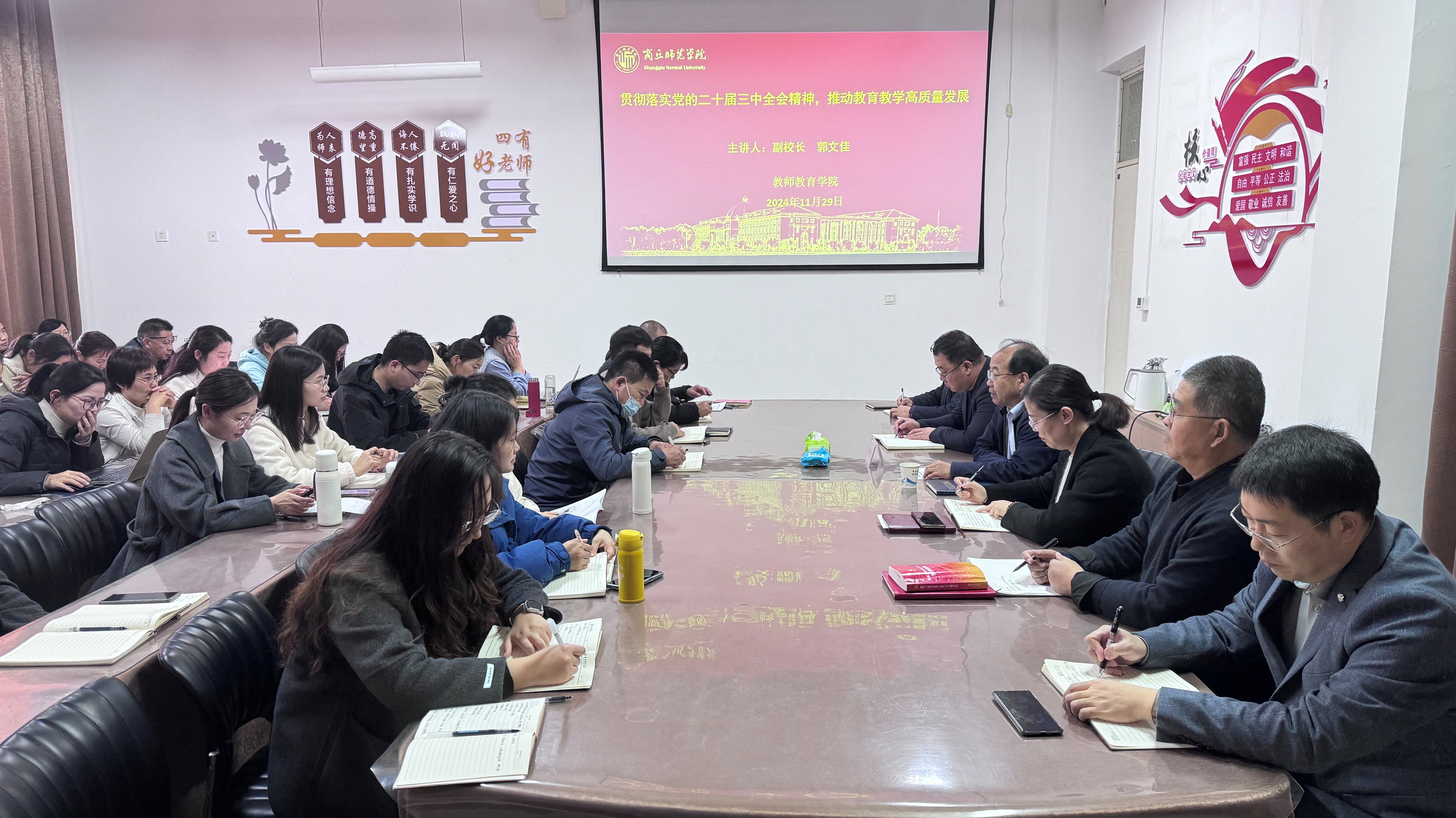 郭文佳深入浅出地阐释了党的二十届三中全会有关统筹推进教育、科技、人才体制机制一体改革的重点内容,强调学习贯彻党的二十届三中全会精神要同学校硕士点申报、本科教育教学审核评估和师范专业认证相结合一体推进,广大教师党员要提高政治站位,增强紧迫感;聚焦学校发展中心任务,全力抓好落实;站稳三尺讲台,潜心教书育人。