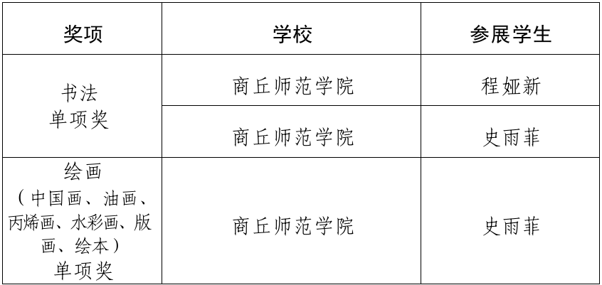 纽约国际官网音乐组、美术组均获高校团体一等奖。其中音乐专业学生杜旭晴获个人全能一等奖,贾昊亭、曹加欣获个人全能二等奖;美术专业学生史雨菲获个人全能一等奖,书法单项奖、绘画单项奖,程娅新获个人全能一等奖,书法单项奖,董晗获个人全能三等奖。