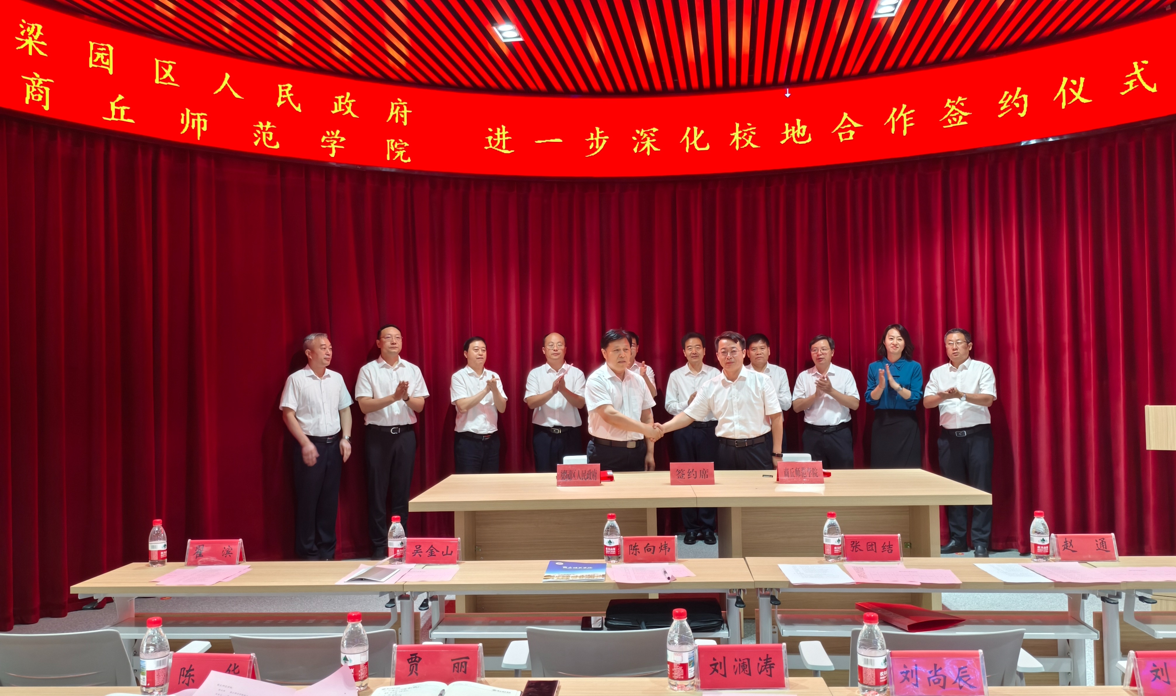 仪式上,翟滨与刘振华分别代表学校和梁园区人民政府签订了进一步深化校地合作协议;翟滨代表学校分别与商丘数智科技有限公司、洁士美建材科技有限公司、河南万邦环保科技有限公司、商丘市恒威科技有限公司、河南省程淑方食品有限公司、商丘市冠领食品有限公司负责人签订校企合作协议。