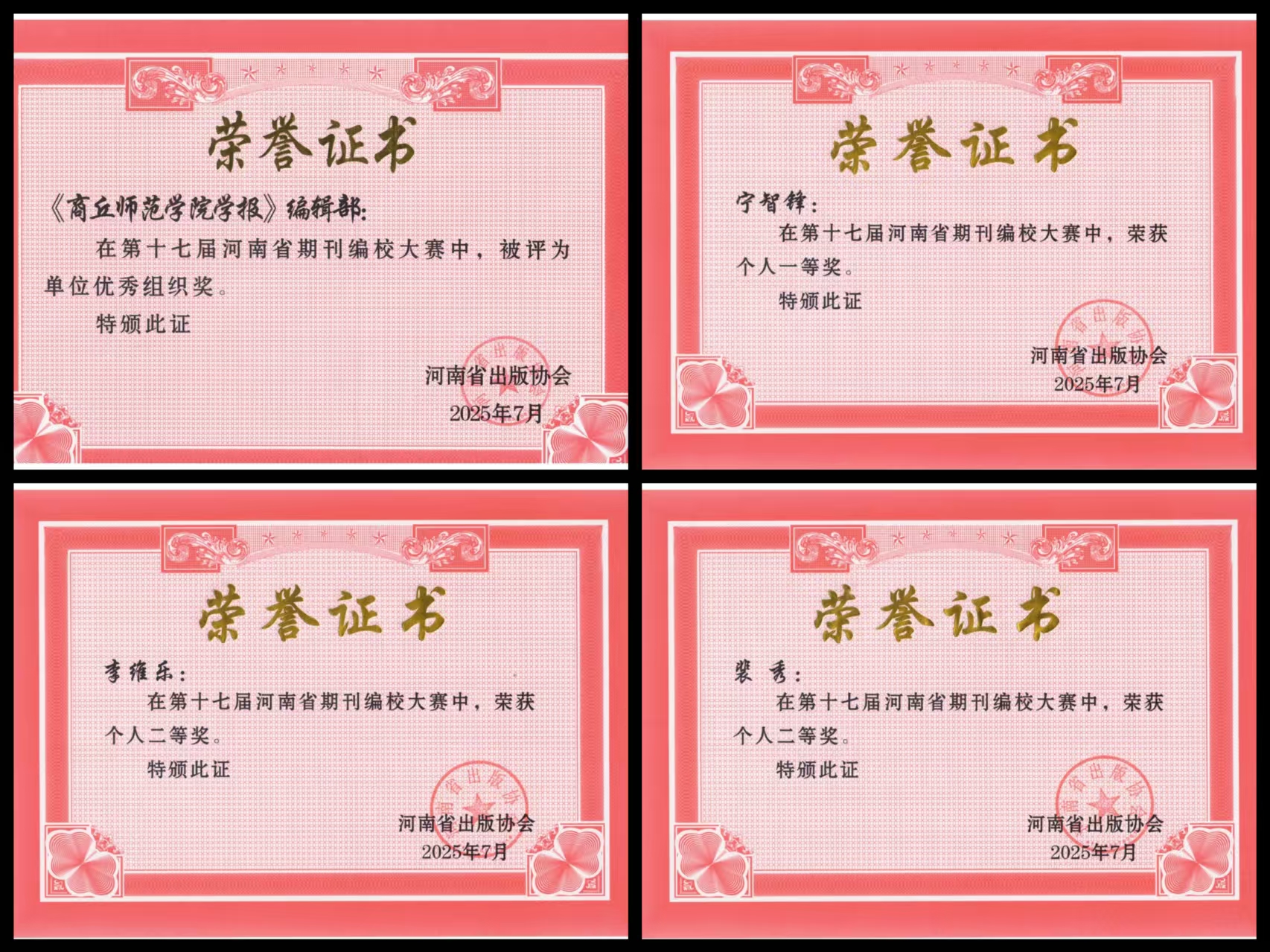 近日,河南省出版协会下发了《河南省出版协会关于表彰第十七届河南省期刊编校大赛获奖单位及人员的通报》,学报编辑部获得单位优秀组织奖,宁智锋副主编荣获编校大赛一等奖,李维乐、裴秀2位编辑荣获编校大赛二等奖。5月27日至31日,河南省出版协会在鹤壁举办了2025年河南期刊出版专业技术人员继续教育培训班(第一期)暨第十七届编校大赛。学报编辑部高度重视,认真组织参与,将参加继续教育培训和参加编校大赛作为提高学报编校质量、抓好内容创新的重要抓手。最终,编辑部所取得了优异成绩,这充分展现了学报编辑部奋发有为、昂扬向上、团结协作的精神风貌。