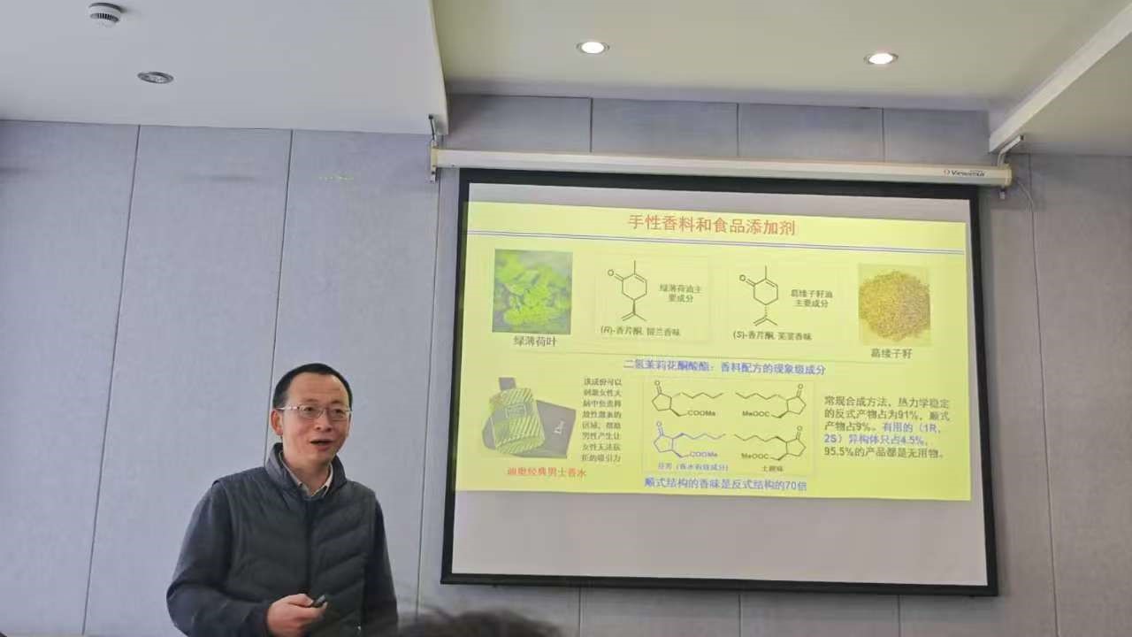 周剑教授讲了手性季碳存在于排名靠前的处方药中,因其具有结构刚性和多样性,成为药物优势骨架。生物活性分子中选择性引入氟代烷基则往往可改善化合物药学性质,对性药物的开发和利用具有重要的意义,其研发难度具有很强的挑战性。同时,周教授多角度探讨了“手性氟烷基取代季碳的不对称催化构建研究”这个复杂的学术问题,介绍了其团队研究的成果,取得的新进展。报告内容丰富深刻,对化学化工学院师生提出了新颖的科研思路和新要求,只有要深耕研究领域,才能更好的挑战困难,还激起了学生探索未知的好奇心和对知识的渴求。