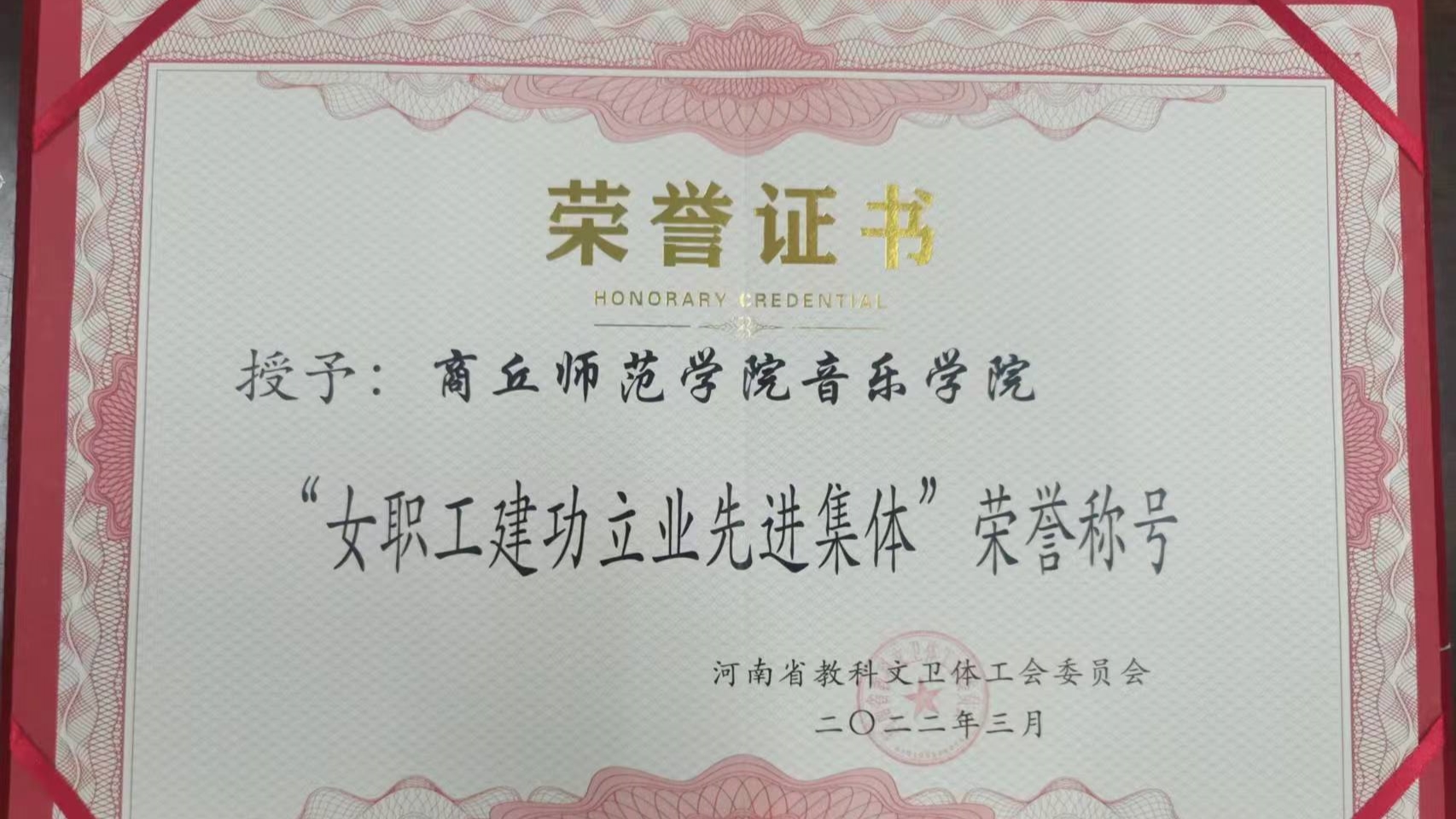 近日,河南省教科文卫体工会委员会授予音乐学院“女职工建功立业先进集体”荣誉称号。