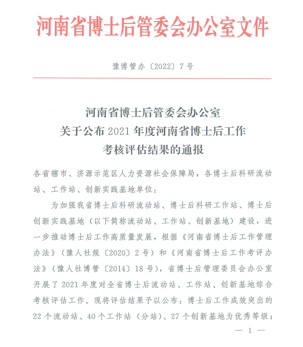 根据《河南省博士后管委会办公室关于公布2021年度河南省博士后工作考核评估结果的通报》(豫博管办【2022】7号),纽约国际官网再次被评为“优秀博士后创新实践基地”。在2021年度全省220个博士后创新实践基地考核中,共27个被评为优秀。