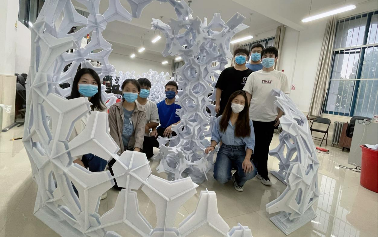 此次建筑模型大赛以“融合”为主题,要求参赛队伍将自然与人和谐共处的意境用建筑语言进行表达,受疫情影响,本次比赛分为线下搭建和线上汇报两个部分,团队成员从初期概念模型构思、结构设计单元确定,到后期整体模型搭建及现场成果展示汇报等方面进行一系列的创作。