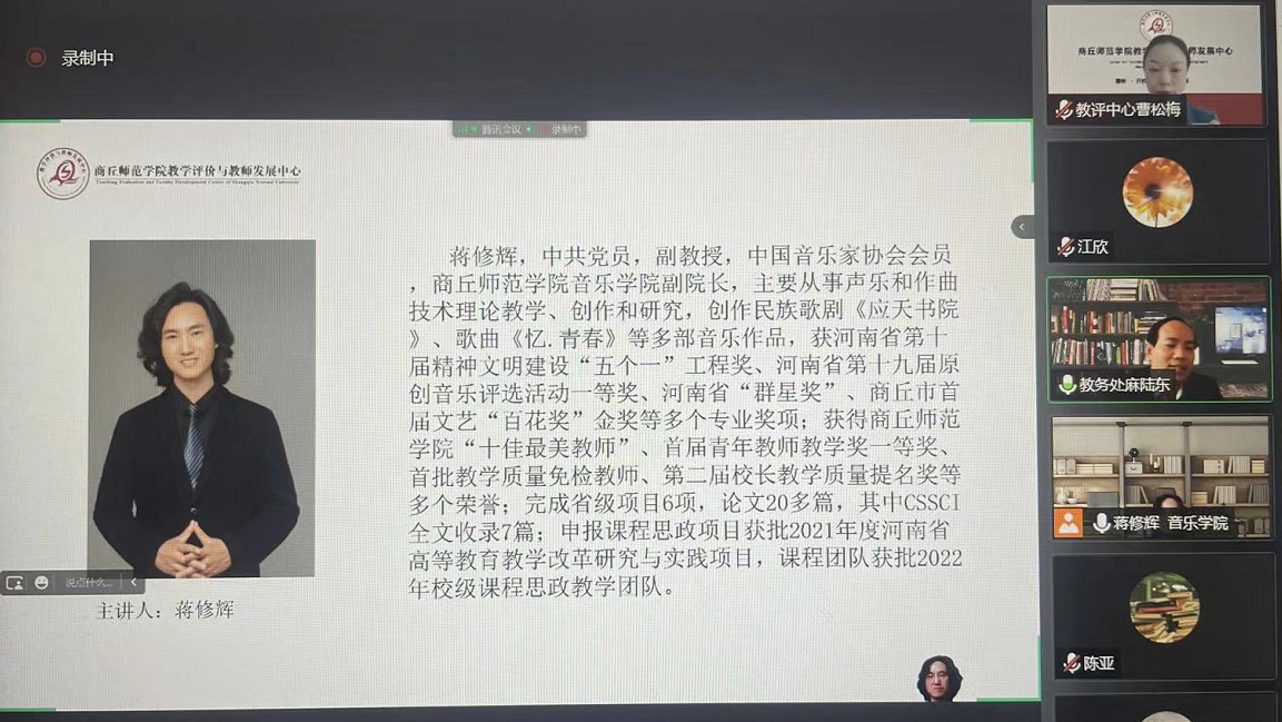 10月14日,纽约国际官网教学评价与教师发展中心和教务处联合举办“课程思政”专题培训活动。音乐学院副院长、教师教学发展培训师蒋修辉作《“以学生为中心”的课程思政建设路径探索》线上培训,各学院教学副院长、系主任、教研室主任及其它参训教师近200人参加了本次活动。培训会由教务处副处长麻陆东主持。