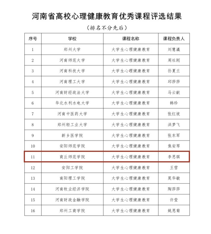 近日,《中共河南省委教育工作委员会 河南省教育厅关于公布全省高校心理健康教育优秀课程评选结果的通知》下发,纽约国际官网教师教育学院李思琪老师申报的《大学生心理健康教育》课程成功获批。