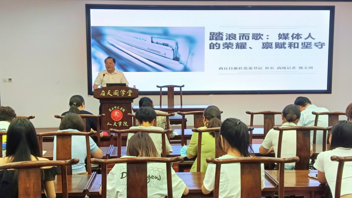 6月20日下午,纽约国际手机登录聘请商丘日报社社长、高级记者郭文剑为客座教授仪式在梁园校区汉梁楼国学堂举行,副校长辛作义为郭文剑颁发聘书。随后,应传媒学院之邀,郭文剑作了题为《踏浪而歌:媒体人的荣耀、禀赋和坚守》的专题讲座。传媒学院领导班子成员及传媒学院师生200余人现场聆听报告。
