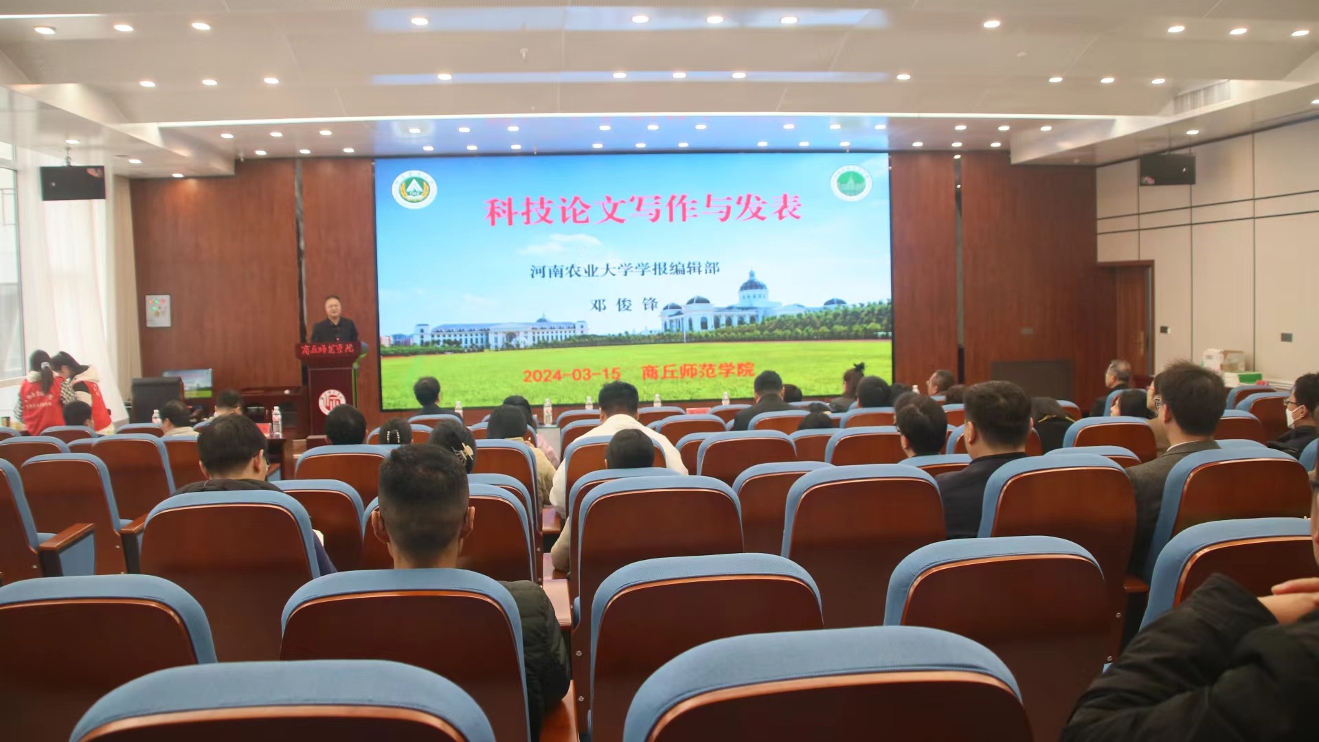3月15日,河南农业大学学报编辑部主任邓俊锋教授在纽约国际官网睢阳校区实训大楼二楼会议室,做了题为“高水平科技论文的写作与发表规范”的学术报告。生物与学院院长周庆峰主持报告会。