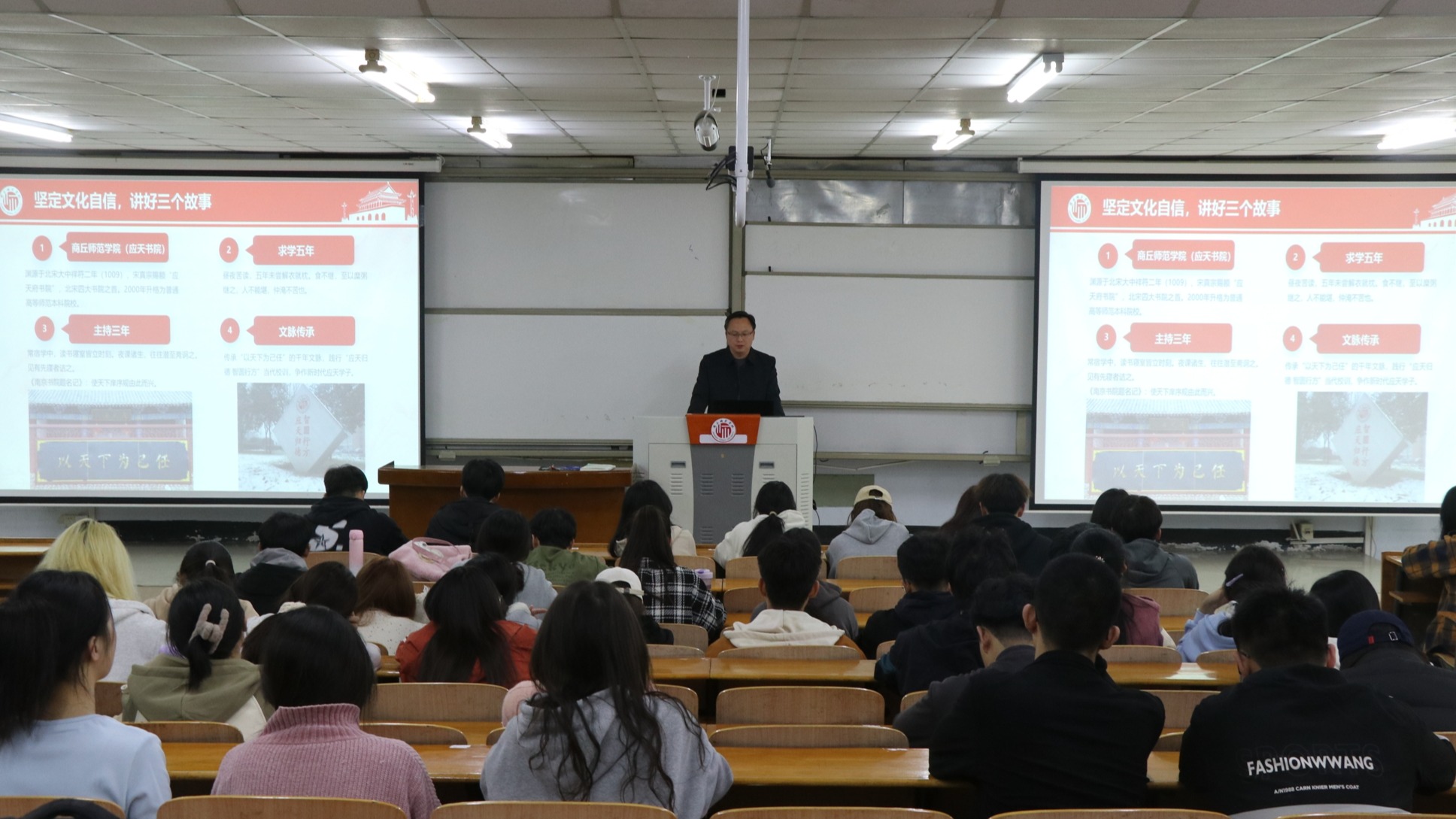 韩坤以“学习习近平文化思想,争做新时代应天学子”为主题,从“习近平文化思想的凝练形成;坚定文化自信、讲好三个故事;争做新时代应天学子”等方面进行讲解。韩坤强调,作为新时代青年,正值青春年华,生逢盛世,要在躬身实践中加深对习近平文化思想的理解,在个人成长和国家建设中贡献力量。他指出,一要胸怀“国之大者”,坚定不移听党话,跟党走,做有理想、敢担当、能吃苦、肯奋斗的新时代好青年;二要学习贯彻习近平总书记在湖南第一师范学院(城南书院校区)考察时的重要讲话精神,自觉秉承应天书院千年文脉,增强做商师人的志气、底气;三要做到自律、慎独,摒弃骄娇二气,继承和发扬吃苦耐劳、自力更生、艰苦奋斗的精神;四要增强做一名新时代“应天学子”的责任感使命感,不负时代、不负韶华,运用自己的专业知识,讲好中国故事、商丘故事、商师故事。