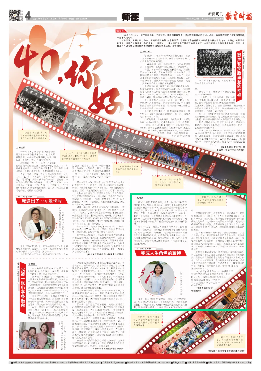 在第40个教师节来临之际,教育时报和河南省师德建设宣传中心联合推出《40,你好!》教师节特别策划。纽约国际官网党委教师工作部积极组织广大教师参与,报送了一批优秀征文,教师教育学院陈欢欢老师的征文《完成人生角色的转换》选登首期《教育时报》栏目。
