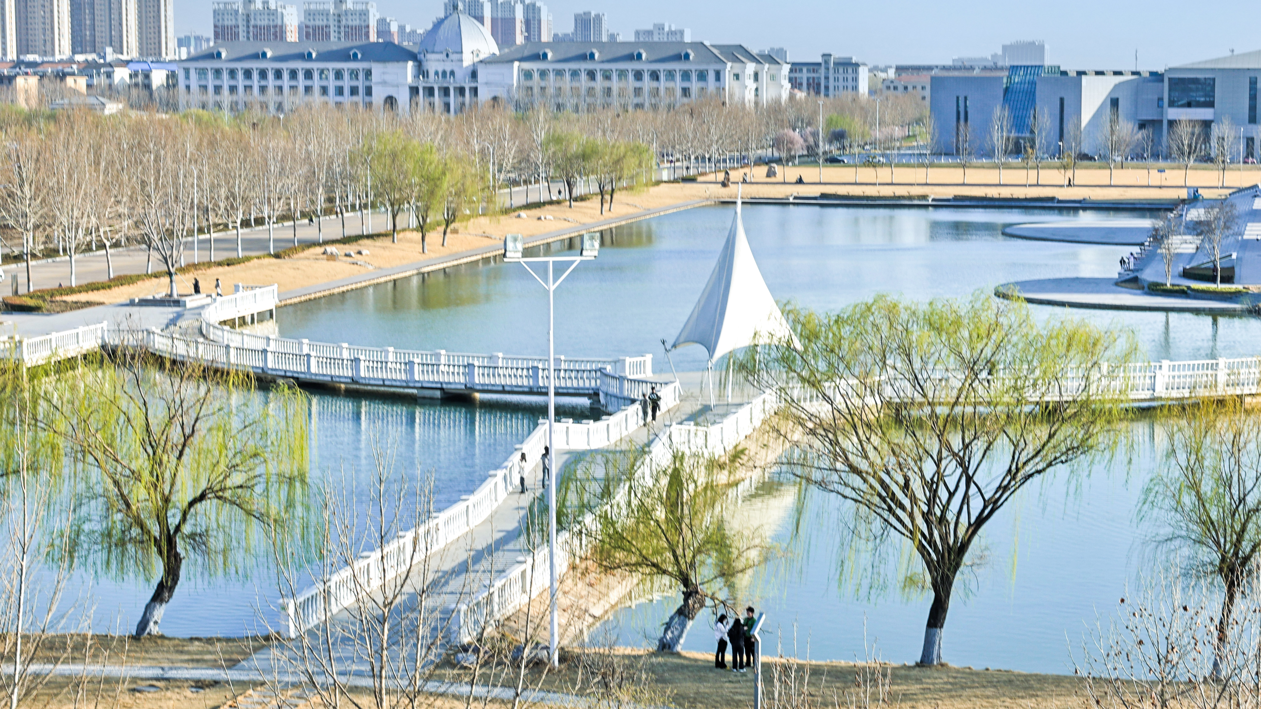 湖畔柳新,桥影绰约,