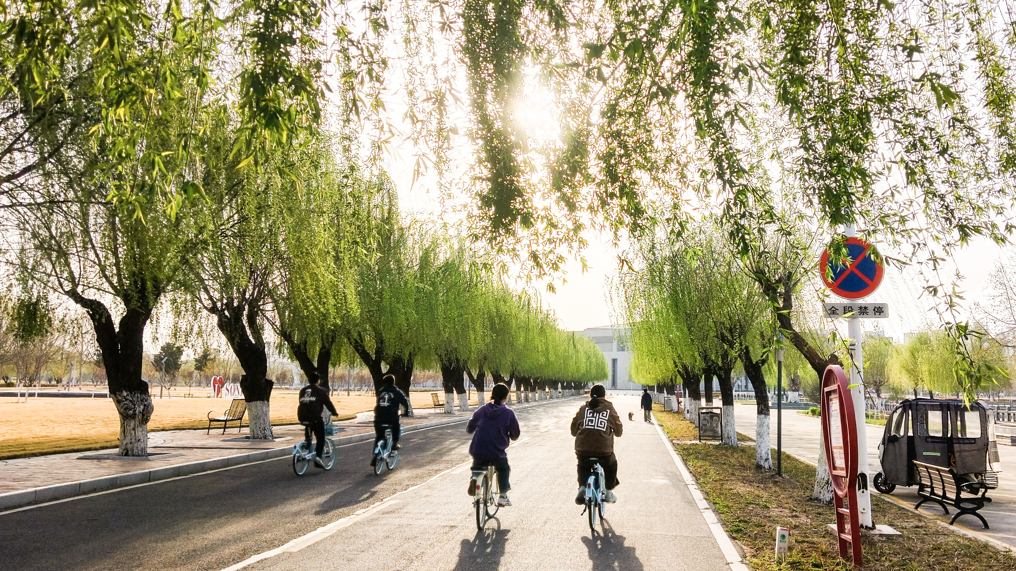 骑行在柳荫道,春风拂面,