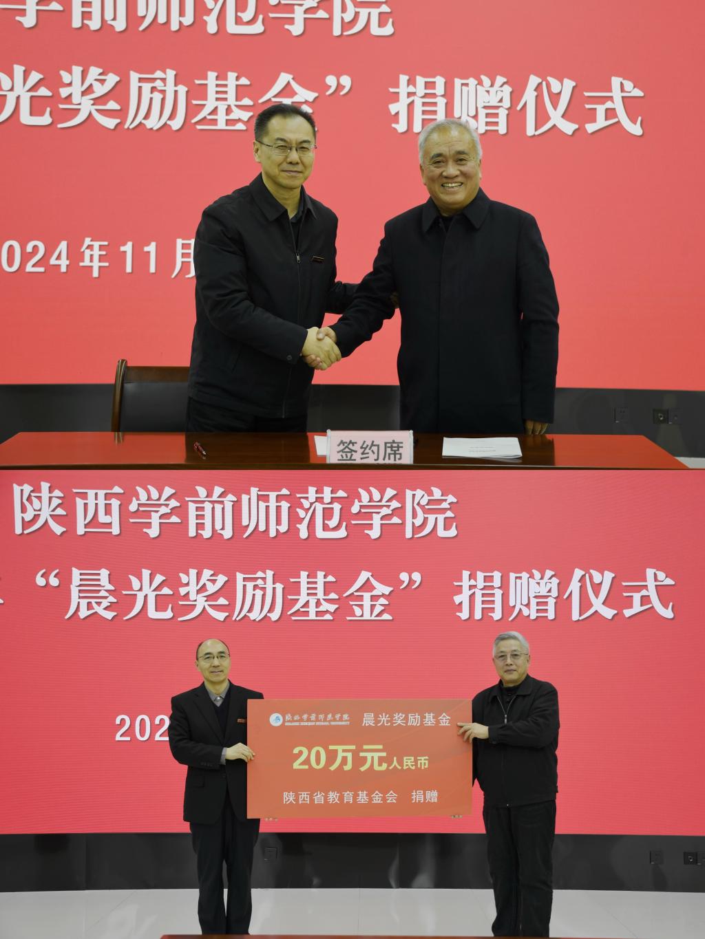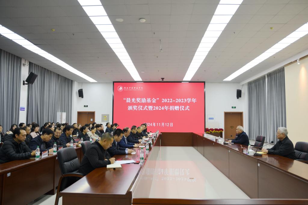 11月12日下午,“晨光奖励基金”2022-2023学年颁奖仪式暨2024年捐赠仪式在学校图书馆三楼会议室隆重举行。陕西省教育基金会副理事长、秘书长孙卫国,艺术总监潘一,beat365校长张健、党委副书记权秋虎、副校长李明军出席会议。仪式由校党委副书记唐宏主持。