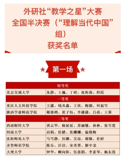 本届大赛以“外语教材的有效使用:数智融合,创新育人”为主题,引导教师落实立德树人根本任务,立足课堂阵地,深挖教材内涵,创新运用数智技术,探索语言与育人融合、数字赋能的课程教学创新,切实提质增效,提升教学育人效果。赛事分为大学英语组、英语专业组和“理解当代中国”组。本次“理解当代中国”组的全国半决赛以《理解当代中国》英语系列教材为教学材料,进入全国总决赛的有来自全国各省的24组教师团队。