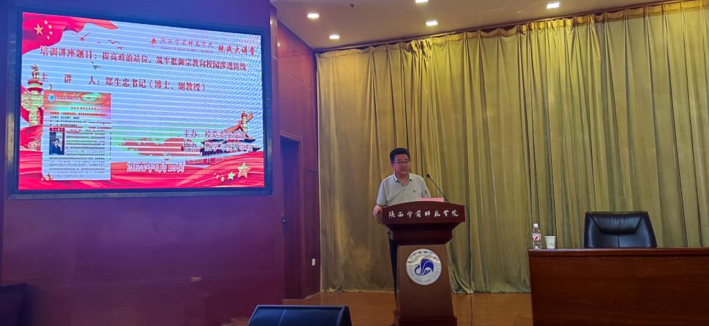为进一步增强广大干部、师生抵御和防范宗教向校园传播渗透的责任感和使命感,提高工作应对能力,筑牢抵御防范思想认识防线,维护学校意识形态领域安全,由校党委统战部主办、数学与统计学院协办,6月18日下午在学术报告厅举办了学校宗教工作专题培训会,邀请陕西师范大学民族教育学院郑生忠书记、博士、副教授,作题为《提高政治站位,筑牢抵御宗教向校园渗透防线》培训讲座。邵必林书记到会场与专家见面交流,权秋虎副书记出席会议并作强调讲话。学校“抵御和防范校园传教渗透工作领导小组”成员单位党委宣传部、党委学工部、校团委、网络与信息化管理、保卫处等单位负责人及成员;各基层党委、党总支书记;各学院党委副书记;各基层党委、党总支统战委员;全体辅导员及学生干部代表等170余人参加培训会。