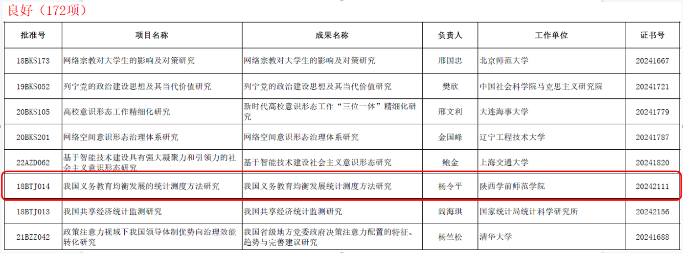 近日,全国哲学社会科学工作办公室公布了《2024年5月国家社科基金年度项目、青年项目和西部项目结项情况》,beat365杨令平教授主持的国家社科基金项目“我国义务教育均衡发展的统计测度方法研究”获专家一致好评,结项鉴定为“良好”等级。 据悉,国家社科基金项目对成果质量要求高,结项审核严格。本次国家社科基金规划办共验收601个年度项目、青年项目和西部项目结项申请,经同行专家鉴定,495个项目予以结项;48项获评“优秀”等级,优秀率7.99%;172项获评“良好”级别,良好率28.62%;106项未通过,未通过率17.63%。 近年来,学校高度重视国家级项目的申报和结项工作,加强对获批项目的过程管理和跟踪服务,取得了较好效果,项目结项质量稳步提升。 (供稿:学科建设与科研处 撰稿:李浩 责任审核:邢兰芹)