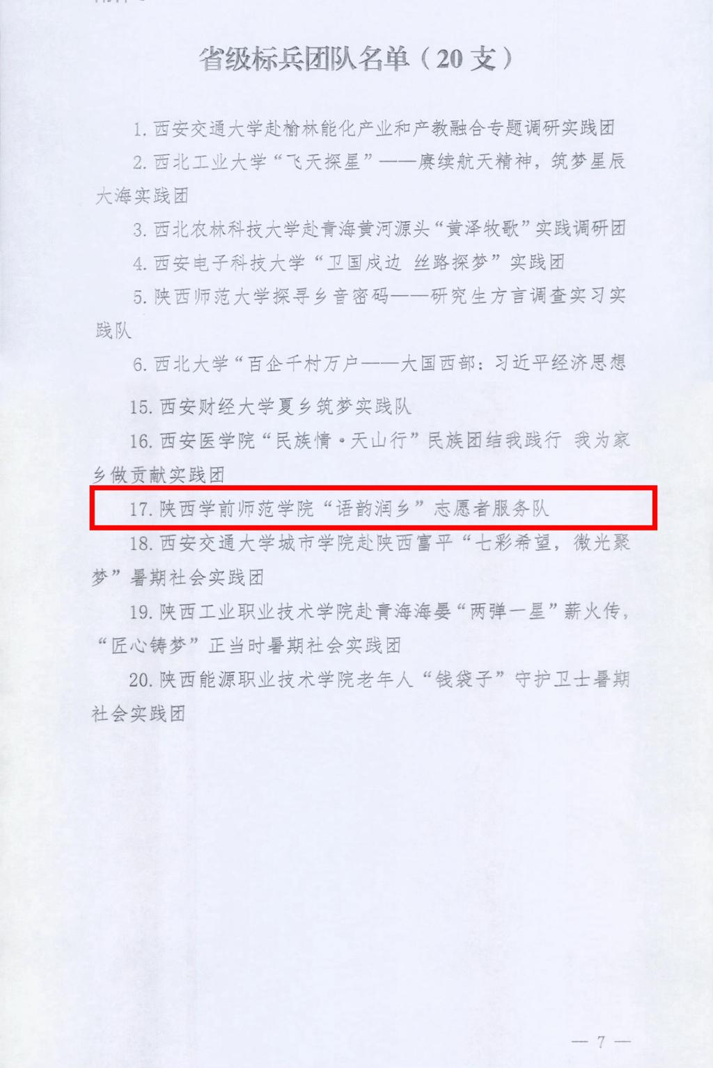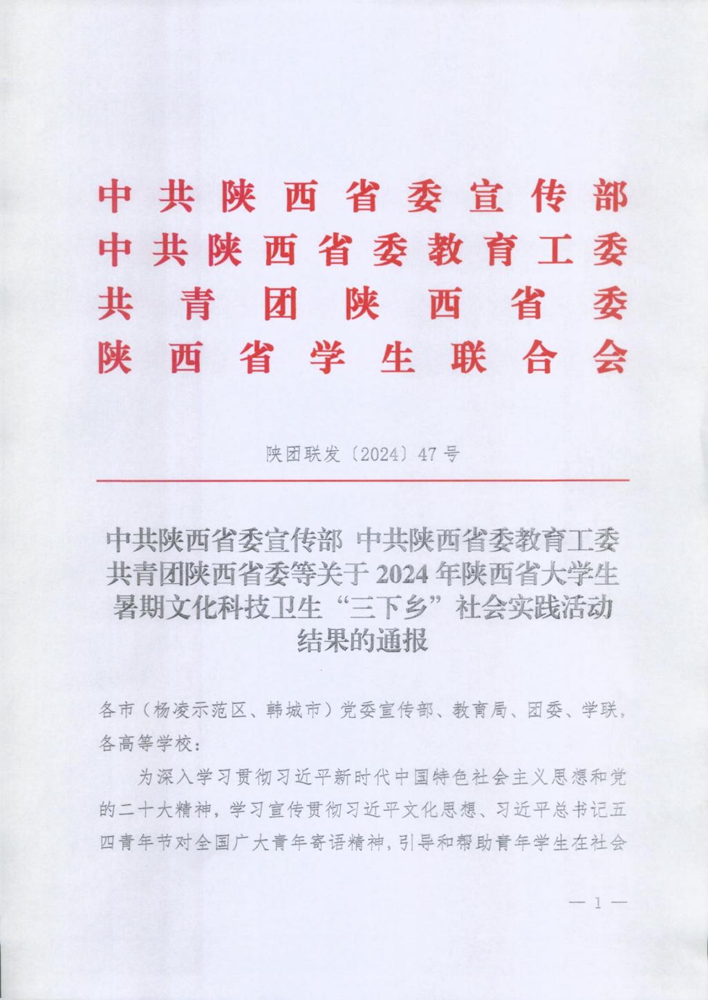 近日,中共陕西省委宣传部、中共陕西省委教育工委、共青团陕西省委等部门对2024年陕西省大学生暑期文化科技卫生“三下乡”社会实践活动先进集体、先进个人进行了通报表扬,beat365荣获省级荣誉5项。学校荣获“省级优秀组织单位”,文学院“语韵润乡”志愿者服务队荣获“省级标兵团队”,马克思主义学院“追寻足迹 一路向阳”实践队荣获“省级优秀团队”,音乐学院赵晨泉、教育科学学院刘佩荣获“省级先进个人”。
