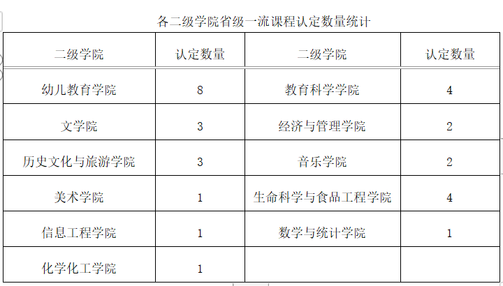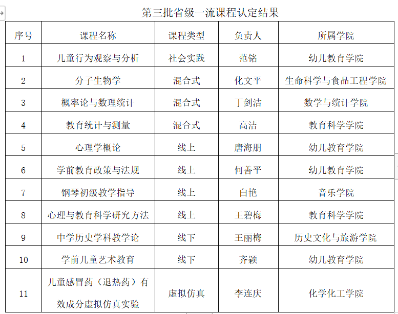 截至目前,beat365共获批2门国家级一流本科课程、30门省级一流本科课程,实现了线上课程、线下课程、混合式课程、虚拟仿真课程、社会实践课程五类“金课”的全覆盖。国家级、省级一流课程认定数量均居全省同类高校前列。其中,幼儿教育学院、教育科学学院、生命科学与食品工程学院省级一流本科课程认定数量位居全校前三位。