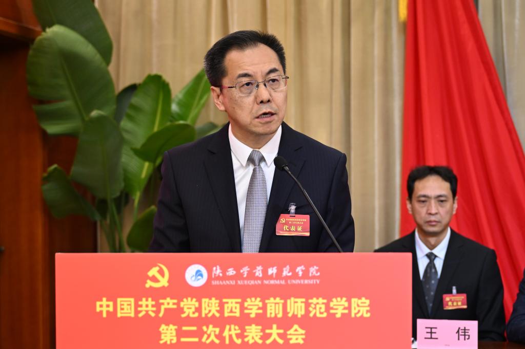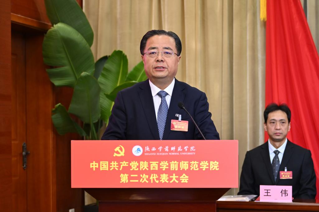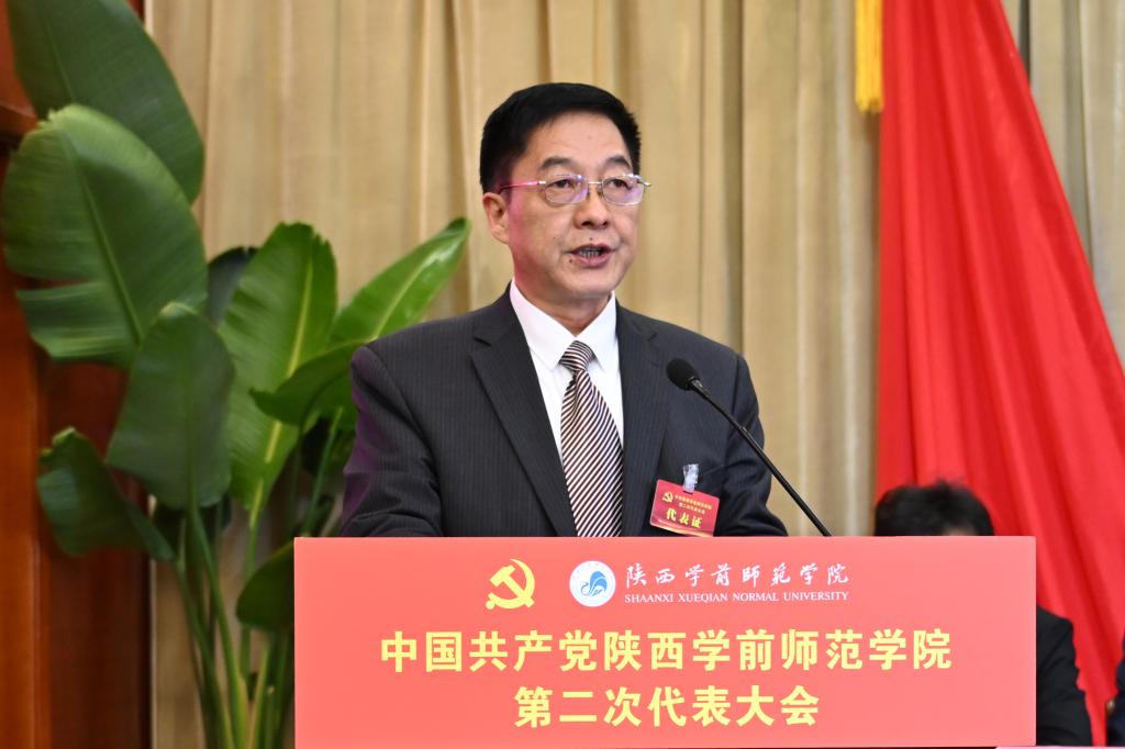 王海波代表省委教育工委、省教育厅,向大会的召开表示热烈的祝贺!向各位代表和全校共产党员、师生员工致以诚挚的问候。王海波充分肯定了学校作为陕西省中小学教师、校园长和基础教育管理干部培养培训的重要基地之一,为陕西基础教育发展做出了重要贡献。他指出,自第一次党代会召开以来,面对改革发展中面临的困难和挑战,学校党委坚持以习近平新时代中国特色社会主义思想为指导,团结带领全校党员师生员工,持续加大问题整改力度,各项工作取得新进展。