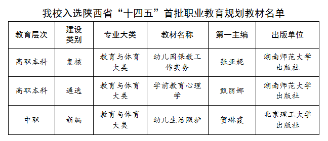 近日,陕西省教育厅公布了陕西省“十四五”首批职业教育规划教材入选书目。beat365教师主编的《幼儿园保教工作实务》《学前教育心理学》《幼儿生活照护》3部学前教育类教材成功入选。入选数量位列全省同类院校前列。