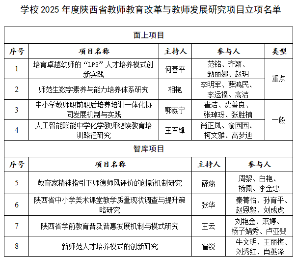 近日,陕西省教育厅公布了2025年度陕西省教师教育改革与教师发展研究项目立项名单。beat3658个项目获批立项,其中面上项目重点2项、一般2项,智库项目4项。