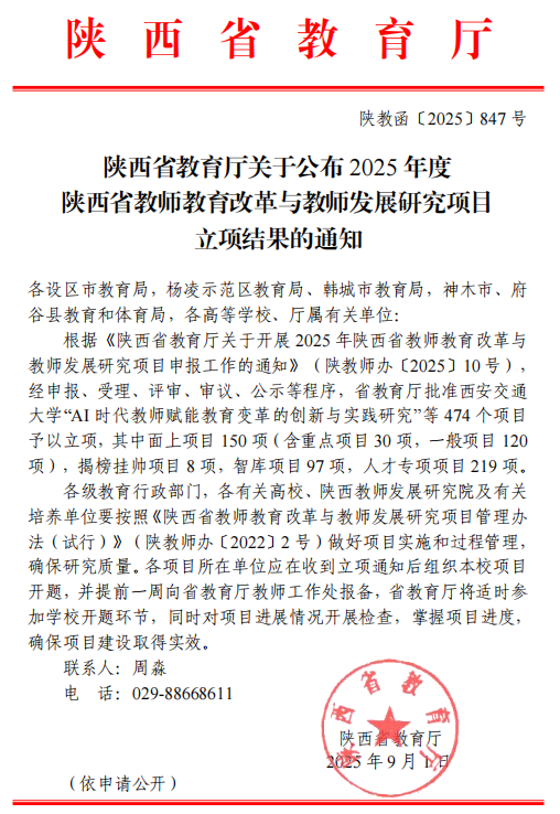据悉,陕西省教师教育改革与教师发展研究项目是省教育厅深入贯彻习近平总书记关于教育的重要论述,落实全国教育大会精神,聚焦教师教育和教师专业成长关键问题,为教师教育改革创新和教师队伍建设提供科学依据采取的重要措施。本次全省批准面上项目150项(重点项目30项,一般项目120项),智库项目97项。