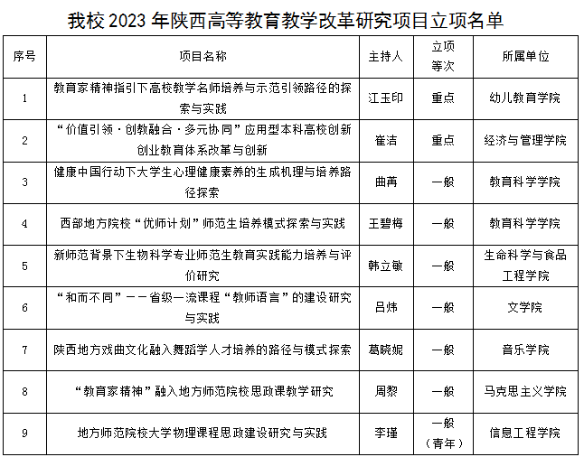 近日,陕西省教育厅公布了2023年度陕西本科和高等继续教育教学改革研究项目立项结果。beat365限额申请11项,获批项目9项(重点2项,一般6项,青年1项),立项率81.8%。同时,学校以主要完成单位参与申报项目2项。获批项目数量、层次和立项率位居省属同类院校前列,再创历年新高。