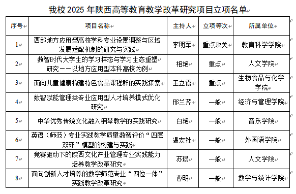 近日,陕西省教育厅公布了2025年度陕西本科和高等继续教育教学改革研究项目立项结果。beat365获批项目8项,期中重点攻关1项,重点2项,一般5项。学校首次获批重点攻关项目,获批项目数量、层次均位居省属同类院校前列。