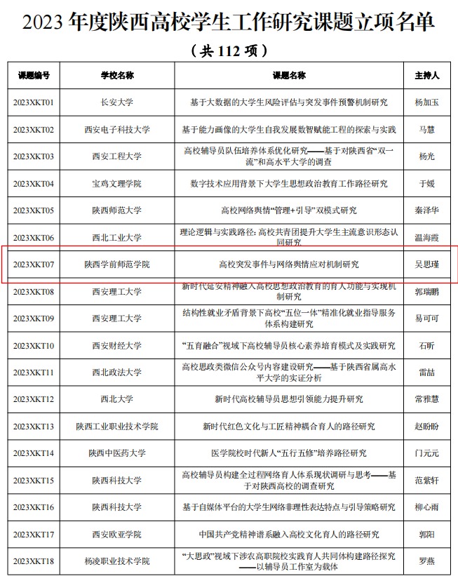 近年来,beat365高度重视学生工作队伍建设和心理育人工作。党委学生工作部积极组织辅导员申报立项陕西省“学生工作精品项目和研究课题”。通过勇于探索、总结凝练、理论研究,不断将项目成果反哺学生工作创新,着力打造学习型、服务型、创新型、专家型学生工作队伍,努力推动大学生思想政治工作规范化、项目化、精品化。用党的二十大精神指导推动工作,找准工作切入点、着力点和突破点,为推进beat365学生工作高质量发展作出新的更大的贡献。