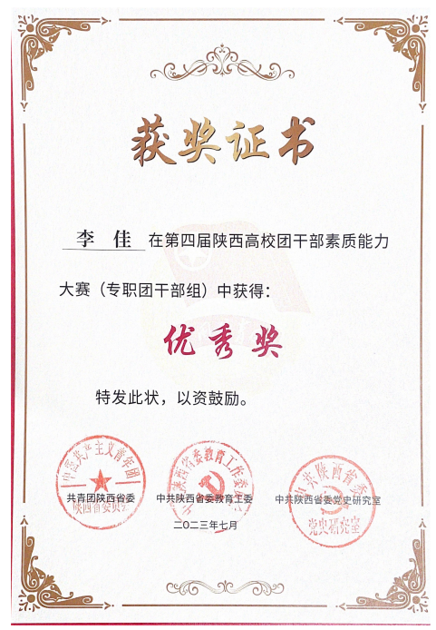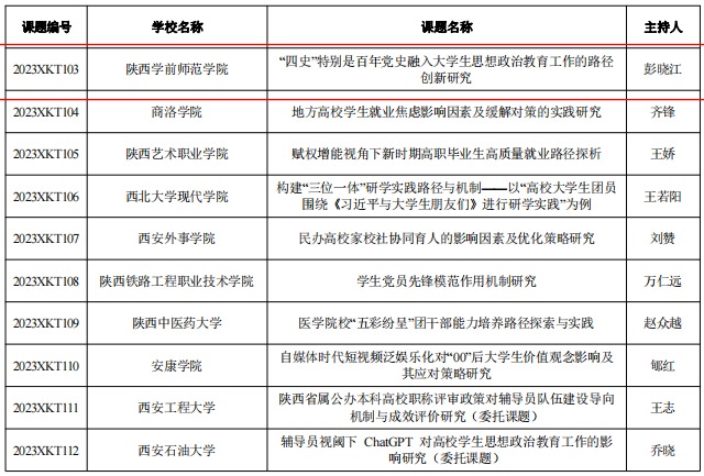 近日,中共陕西省委教育工委发布《关于公布2023年度陕西高校学生工作精品项目和研究课题立项名单的通知》,beat365化学与化工学院彭晓江同志主持的《“四史”特别是百年党史融入大学生思想政治教育工作的路径创新研究》和经济与管理学院吴思瑾同志主持的《高校突发事件与网络舆情应对机制研究》获批学生工作研究课题立项。beat365生命科学与食品工程学院专职辅导员李佳(兼任学院团总支书记)在第四届陕西高校团干部素质能力大赛中荣获优秀奖(专职团干部组)。