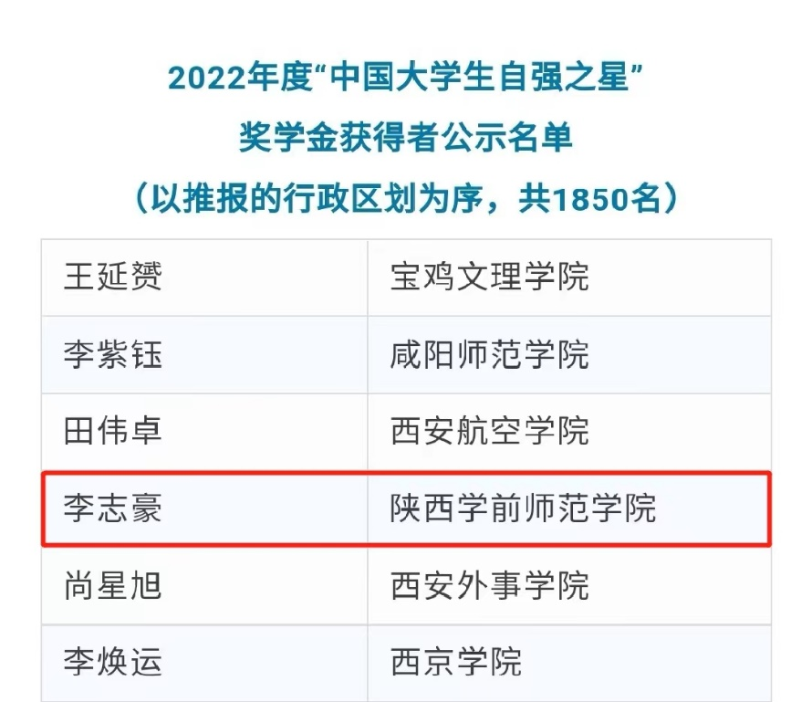 近日,由共青团中央、全国学联指导,中国青年报社、新东方教育科技集团、中国青年创业就业基金会联合举办的2022年度“中国大学生自强之星”奖学金评选结果揭晓。活动以“踔厉奋发,勇毅前行”为主题,旨在树立当代大学生中热爱祖国、品行优良、不畏艰难、自强不息的榜样。经过学校团委推荐、省级初选、全国评审等环节,beat365外国语学院2022级英语专业学生李志豪荣获2022年度“中国大学生自强之星”和“陕西省大学生自强之星标兵”荣誉称号。