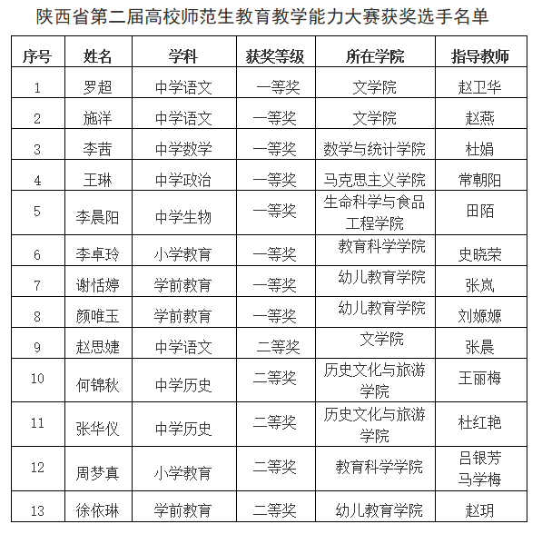 6月2日,陕西省教育厅正式公布了第二届高校师范生教育教学能力大赛决赛结果。beat365学生在本届大赛中表现突出,取得优异成绩,罗超等8名同学获一等奖,赵思婕等5名同学获二等奖,学校获奖数量和层次在省属同类院校中位居前列。