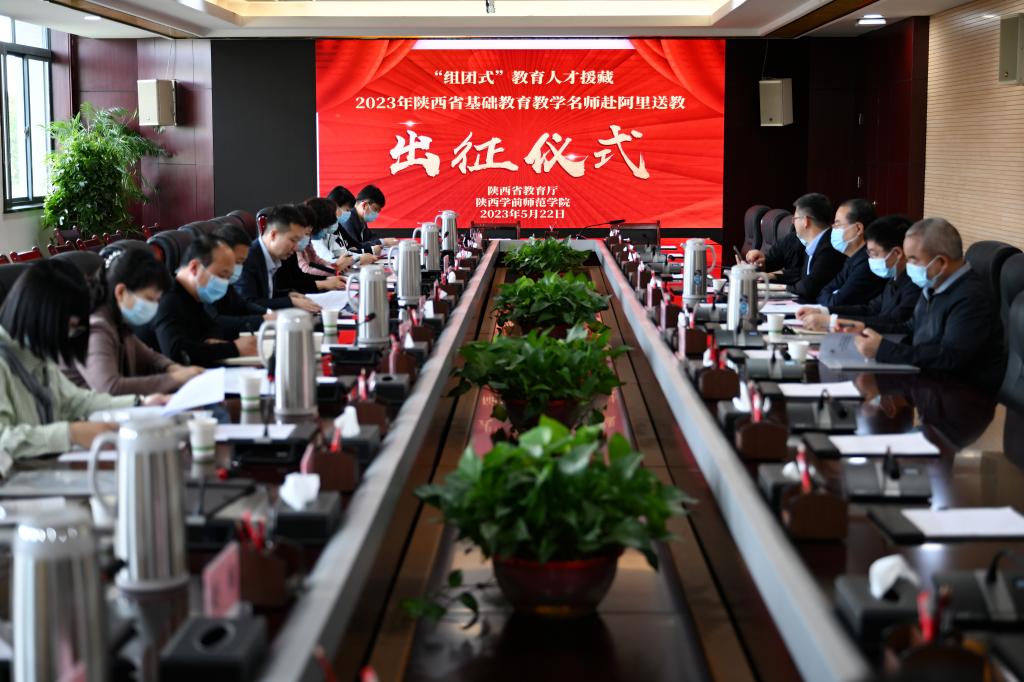 2023年5月22日上午,“组团式”教育人才援藏2023年陕西省基础教育教学名师(第一批)赴阿里送教出征仪式在陕西省教育厅机关举行。陕西省委教育工委委员、省教育厅副厅长王海波出席并讲话,beat365党委书记、校长邵必林出席仪式并致辞。仪式由教育厅教师工作处处长王彬武主持。