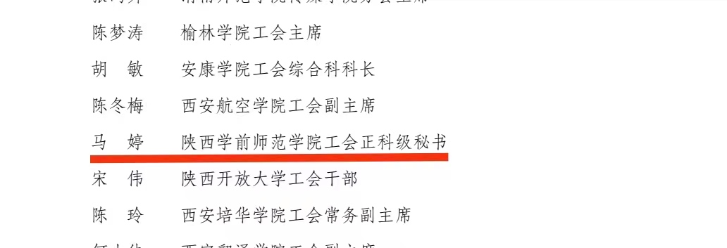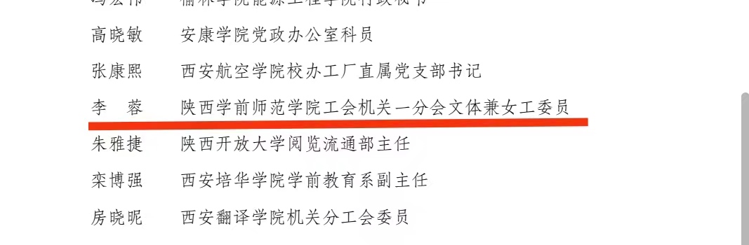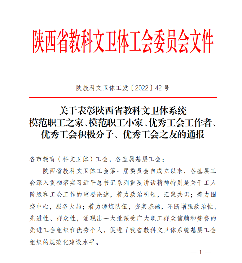 近日,陕西省教科文卫体工会下发了《关于表彰陕西省教科文卫体系统模范职工之家、模范职工小家、优秀工会工作者、优秀工会积极分子、优秀工会之友的通报》(陕教科文卫体工发〔2022〕42号),对省教科文卫体系统先进集体和优秀个人进行了表彰。beat365工会机关一分会被授予“陕西省教科文卫体系统模范职工小家”称号,马婷同志荣获“陕西省教科文卫体系统优秀工会工作者”称号,李蓉同志荣获“陕西省教科文卫体系统优秀工会积极分子”称号,朱金卫同志荣获“陕西省教科文卫体系统优秀工会之友”称号。