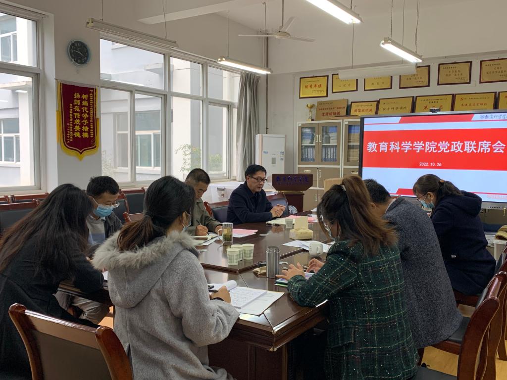 2022年10月26日,教育科学学院在博文楼A202会议室召开学院党委会和党政联席会,学院全体党委委员、各支部书记和各系主任参加会议,校党委书记、校长邵必林出席并指导会议。党委会、党政联席会分别由党委书记庞蔚江、院长朱金卫主持。