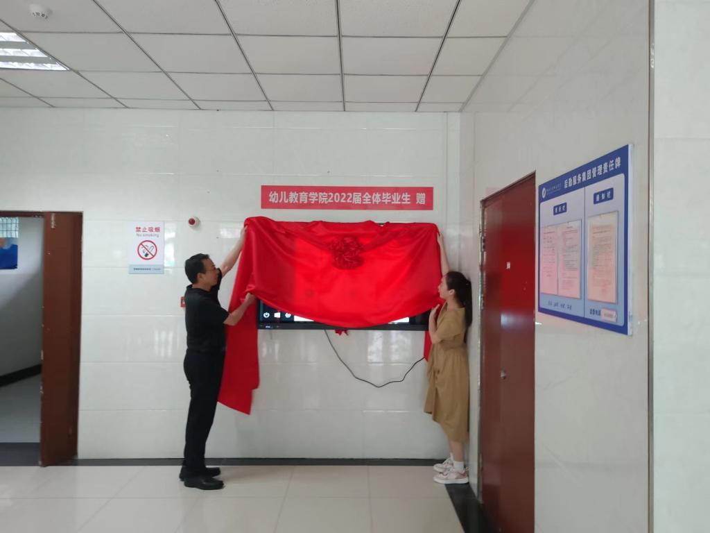捐赠仪式上,付建成书记与2022届毕业生代表涂国露一起为捐赠的毕业礼物---多媒体教学一体机揭幕。随后,2020级学生康妮使用新设备对我院实验实训室的情况进行了简要介绍。