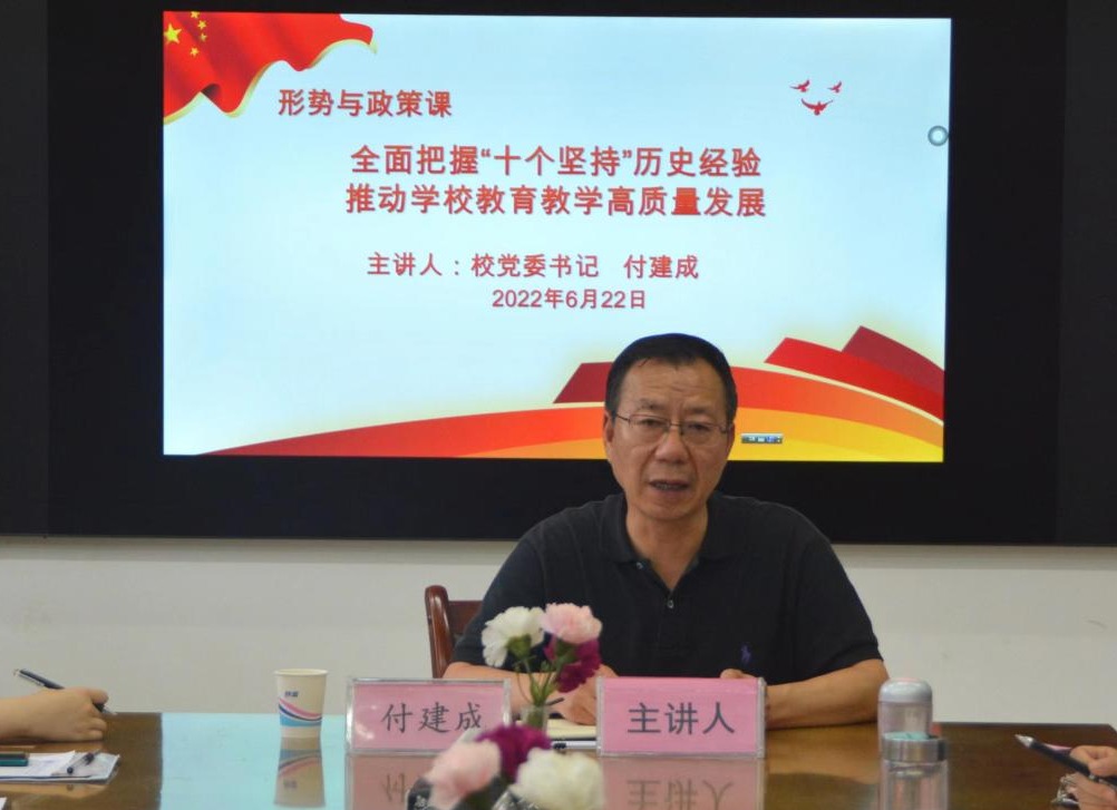 会后,付建成书记为幼儿教育学院师生讲授了主题为《全面把握“十个坚持”历史经验 推动学校教育教学高质量发展》的形势与政策课。课上讲到,十九届六中全会审议通过了《中共中央关于党的百年奋斗重大成就和历史经验的决议》,以宏阔历史视角和深厚历史智慧,从“十个坚持”方面,深刻总结概括了中国共产党百年奋斗的历史经验。付书记从准确把握“十个坚持”的丰富内涵入手,带领师生深刻解读领会了“十个坚持”的重大意义,坚持党的领导、坚持人民至上、坚持理论创新、坚持独立自主、坚持中国道路、坚持胸怀天下、坚持开拓创新、坚持勇于斗争、坚持统一战线、坚持自我革命,是开创未来的行动纲要,是百年大党伟岸形象的生动彰显,是党和人民共同创造的精神财富。