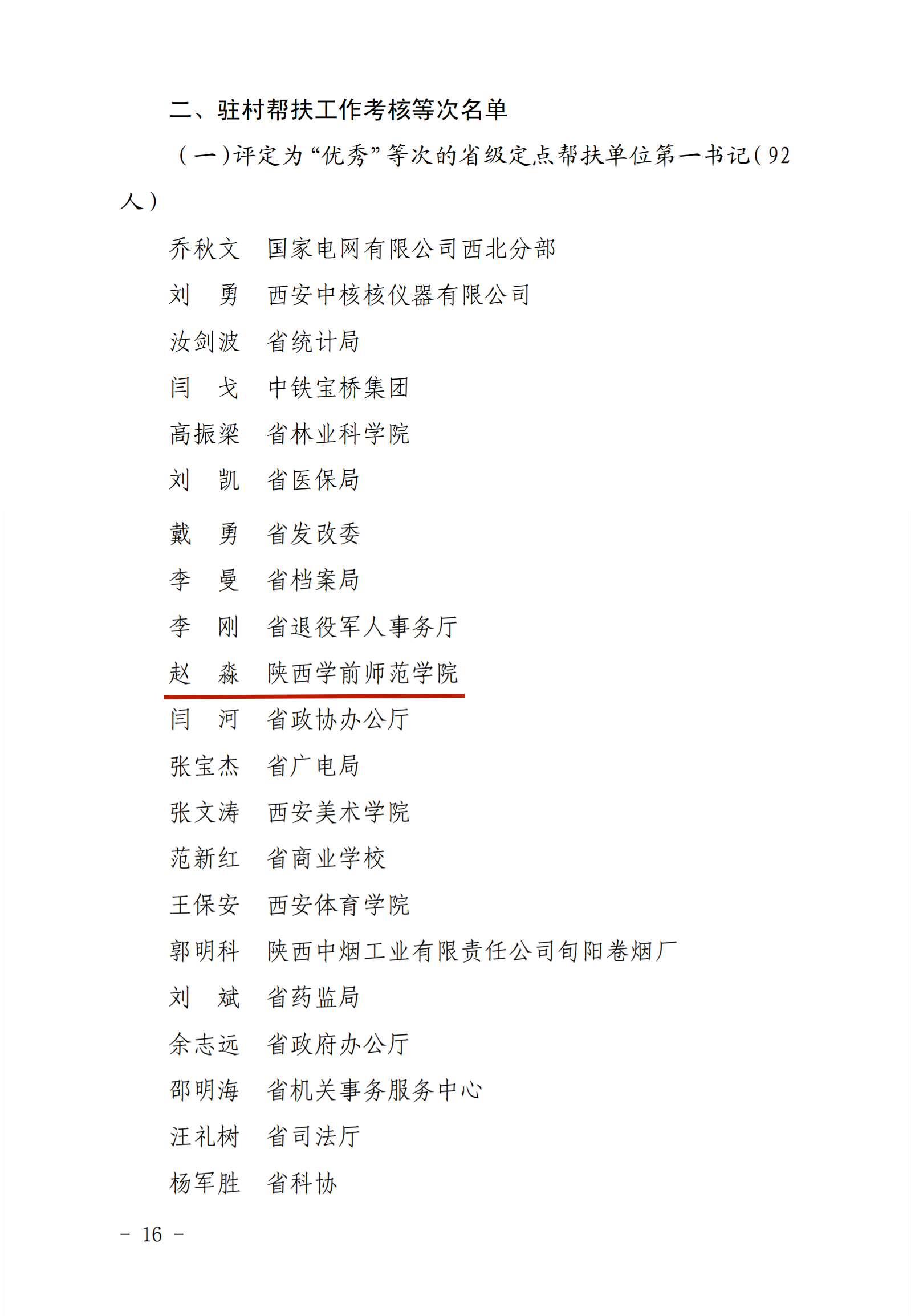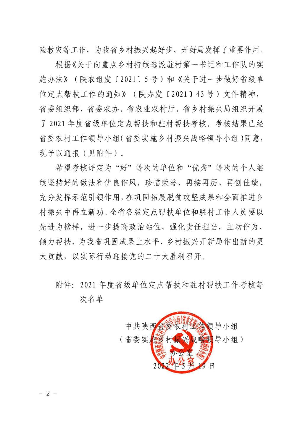 近日,中共陕西省委农村工作领导小组(省委实施乡村振兴战略领导小组)办公室印发《关于2021年度省级单位定点帮扶和驻村帮扶工作考核结果的通报》,公布由省委组织部、省委农办、省农业农村厅、省乡村振兴局组织开展的2021年度省级单位定点帮扶和驻村帮扶考核结果,beat3652021年驻村帮扶干部、留坝县江口镇元树村第一书记、驻村工作队队长赵淼同志荣获驻村帮扶单位第一书记考核优秀等次,这也是留坝县省级帮扶团七个单位中唯一的第一书记优秀等次。