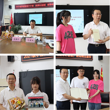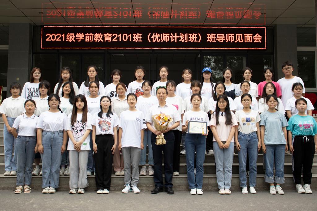 见面会在热烈的欢迎声中开启,2101班(优师计划班)全体学生欢迎班级新成员校党委书记付建成同志的加入。见面会上,班长李梦璐对班级情况进行详细介绍。作为联系班级校领导,付建成书记对加入该班级表示激动,并对同学们提出三点要求:一是志存高远。希望同学们要勤于思考、加强实践锻炼,为步入社会参加工作打下坚实的基础;希望大家对教师职业抱有浓厚的兴趣,朝着优秀、高质量的幼儿教师不断努力,为未来国家基础教育做出贡献,培养民族未来的希望。二是刻苦自律,学会利用好四个资源,即课堂资源、图书馆资源、好老师资源、班级资源。三是在青春的赛道上做一个高质量的奔跑者。希望大家相互理解、支持、包容、关心和尊重,形成良好的班风和学风,通过高质量的奔跑,托起民族未来的希望。