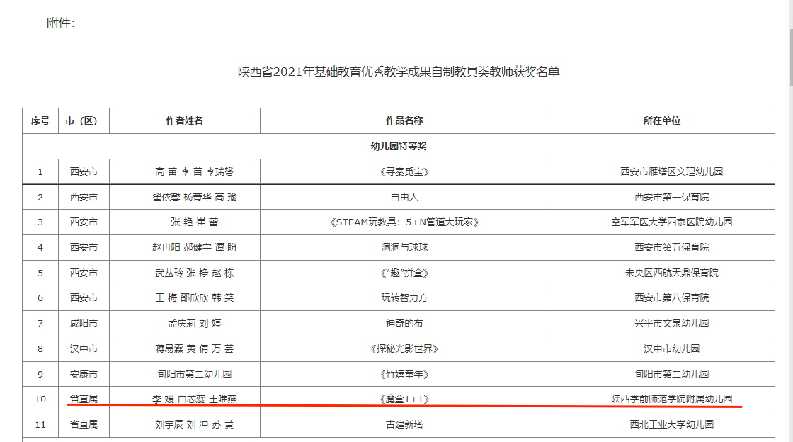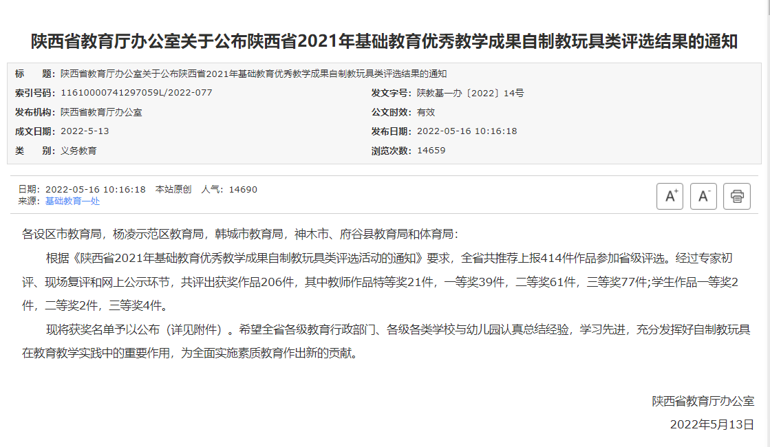 5月13日,由陕西省教育厅主办的陕西省2021年基础教育优秀教学成果自制玩教具玩具类评选活动结果正式公布。此次活动,全省共推荐上报414件作品参加省级评选。经过专家初审、现场复评和网上公示环节,共评出获奖作品216件,其中教师作品特等奖21件,一等奖39件,二等奖61件,三等奖77件。学生作品一等奖2件,二等奖2件,三等奖4件。