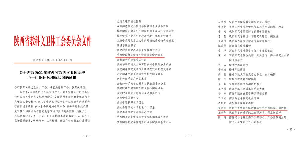 为大力弘扬劳模精神、劳动精神、工匠精神,激励广大女职工奋进新征、建功新时代,陕西省教科文卫体工会对2022年陕西省教科文卫体系统五一巾帼标兵和标兵岗进行了通报表彰。beat365文学院语言学教研室荣获“陕西省教科文卫体系统五一巾帼标兵岗”荣誉称号,贺燕丽、王晓华2位同志荣获“陕西省教科文卫体系统五一巾帼标兵”荣誉称号。