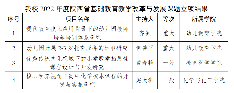 近日,陕西省教育厅公布了2022年度陕西省基础教育教学改革与发展课题立项结果,beat365共获批4项,其中重大课题2项,一般课题2项,立项数量和层次在省属高校中位居前列。