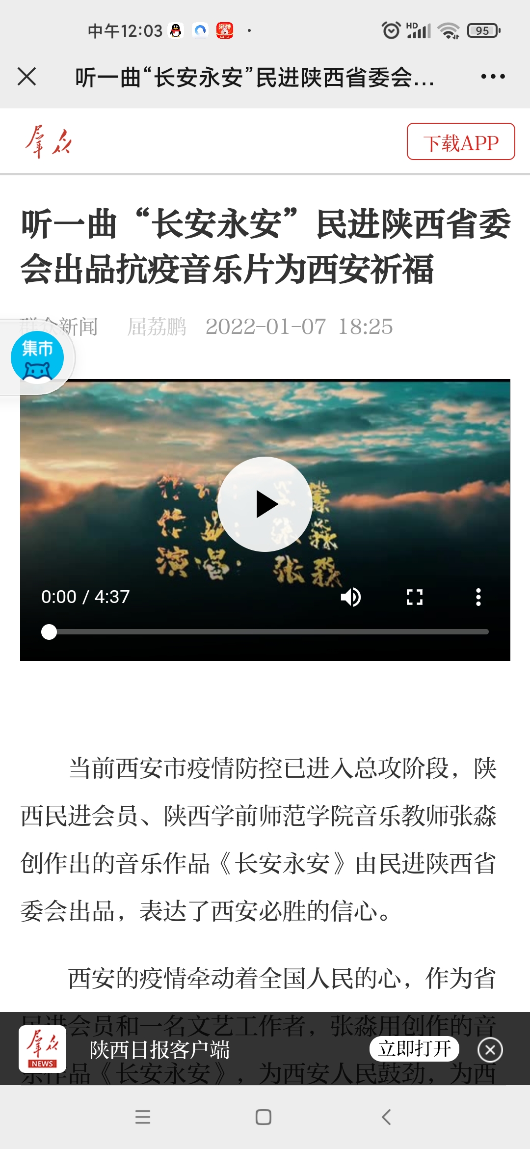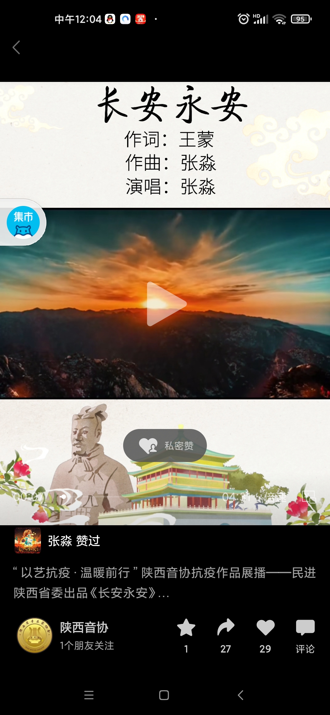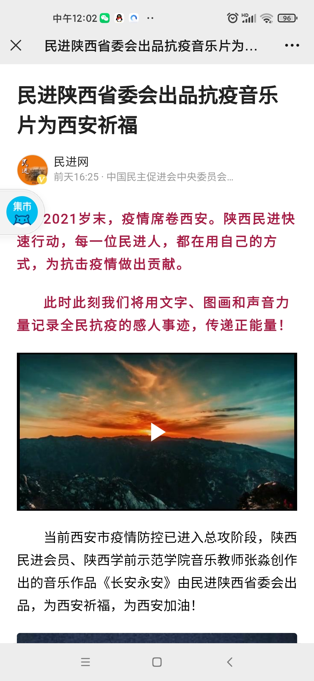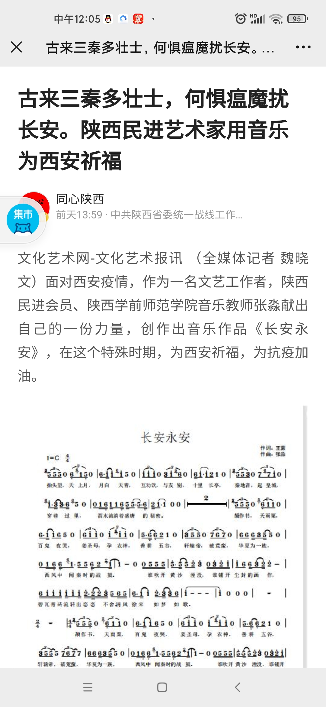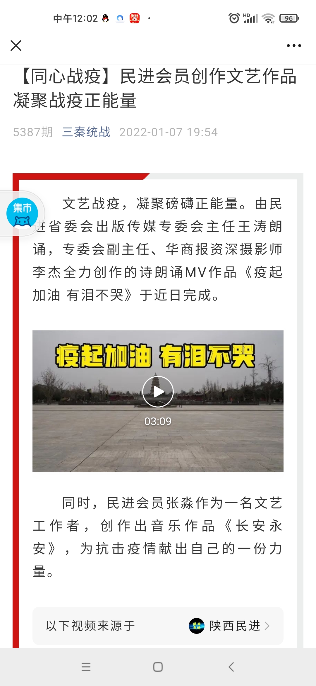 在我市发起抗疫总攻,攻坚拔寨的关键时刻,为了热情讴歌抗疫一线的白衣战士、志愿服务者,为西安祈福、为西安加油,期盼西安早日恢复往日的生机和活力,beat365民进会员、音乐教师张淼发挥专长,携手主创并演唱了作品《长安永安》,正如他所言,要用所学为西安抗疫贡献自己的一份力量。歌曲MV制作美轮美奂,曲风彰显秦风秦韵,展示了我们西安厚重的文化底蕴和面对困难赳赳不屈的气概,激励大家坚定信心、下定决心、勠力同心,一定会打赢疫情防控阻击战歼灭战。