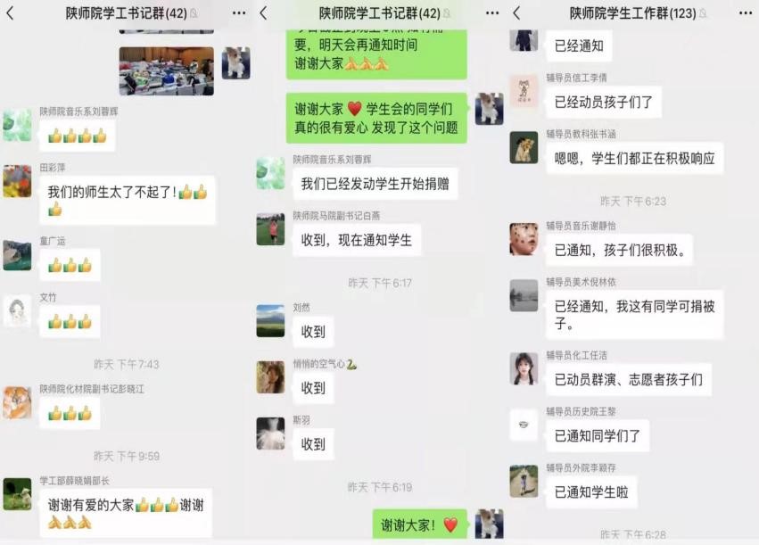 疫情发生后,学工系统迅速投入校园疫情防控战线,积极协同学校相关单位,做好学生疫情防控指导和突发疫情应急处置工作。摸排密接学生,统计数据上报,组织核酸检测,夯实工作责任。学工部积极联系学校相关部门及考试中心,尽最大努力让每一位考研学生安全有序的参加研究生考试。12月23日晚,在完成全员核酸检测任务后,学工系统又组织号召全校师生对因疫情无法回家的食堂工作人员捐赠御寒物资。各二级学院师生纷纷响应,踊跃参与,令人动容。再次证明疫情面前,陕师院全体师生团结一致,共克时艰,师院学工人用实际行动践行责任和使命,将“坚决将疫情防控在校门之外,防止疫情向校园蔓延”的决心落实在校园的每一个角落。