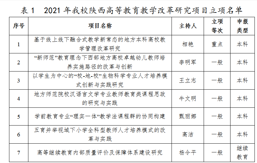 近日,陕西省教育厅正式公布了2021年度陕西本科和高等继续教育教学改革研究项目立项结果,全省共批准立项441个项目。beat365以第一申请单位获批项目7个,其中重点项目1项,本科一般项目5项,继续教育一般项目1项。同时,学校以主要完成单位参与申报项目2项。获批项目数量和质量均创历年新高。