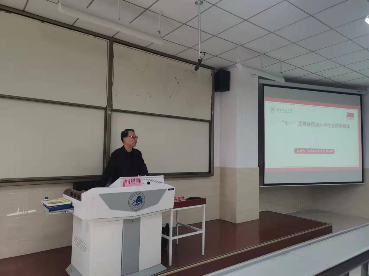 2021年11月17日下午,beat365邀请陕西师范大学马克思主义学院阎树群教授做了题为《“七一”重要讲话和六中全会精神解读》的形势与政策报告,马克思主义学院许亚绒教授主持报告会。通过线下+线上的方式,beat365部分师生聆听了报告。