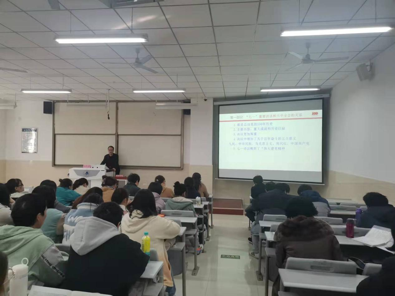 阎树群教授主要从三个部分介绍“七一”重要讲话和十九届六中全会精神:一、“七一”重要讲话和六中全会的关系;二、三个历史决议的关系;三、重大成就和历史经验。阎教授用幽默的语言、浅显易懂的历史故事、珍贵的图片资料,讲述了中华民族的奋斗史、分析了中国共产党带领中华民族取得胜利的重要意义和宝贵的历史经验。