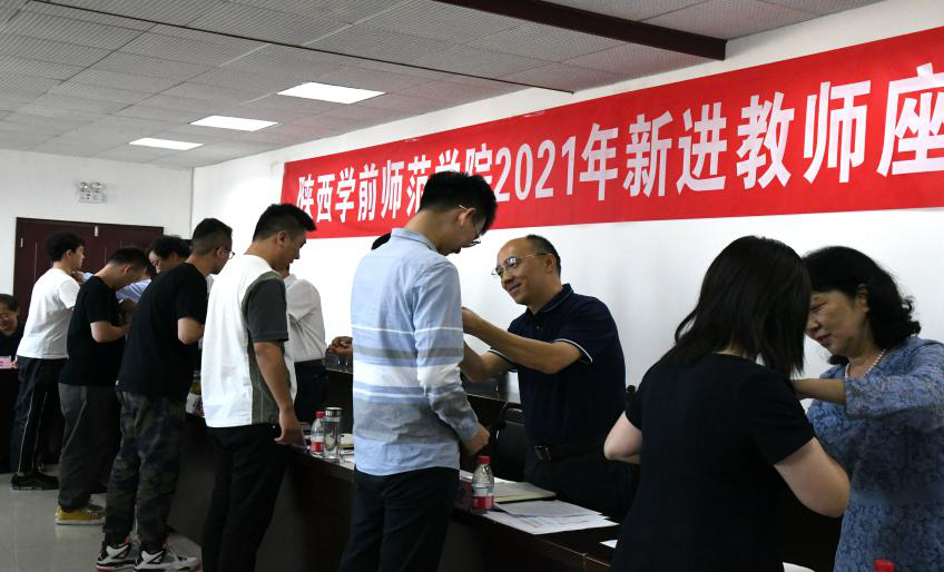 随后,由校领导为新进教师代表佩戴校徽。