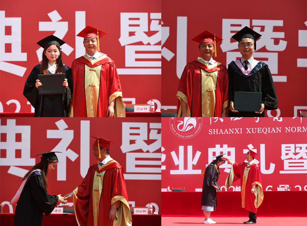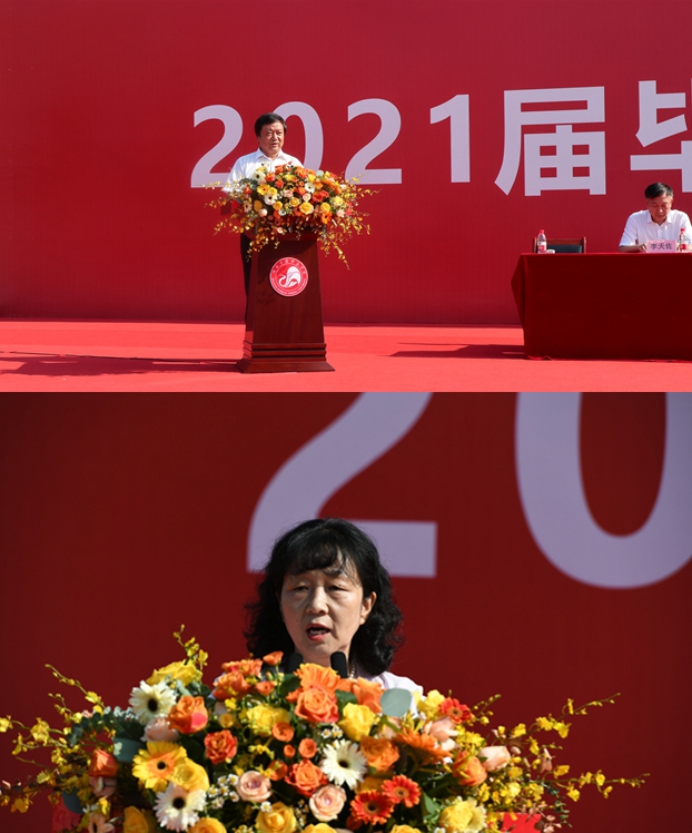 校长邵必林发表了饱含温情、富有哲理的讲话。他首先对2021届毕业生圆满完成学业表示了衷心的祝贺,并对在校期间同学们取得的成绩表示了肯定和感谢。随后他对毕业生提出了五点希望:一是要胸怀祖国,担起民族复兴重任;希望同学们无论身处何时、何地,无论身处人生什么阶段、何种岗位,都能始终坚守爱国情怀,践行对国家的责任和对民族的担当。二是要心怀梦想,做时代的追梦者圆梦人;希望同学们自觉把个人理想与国家的前途、民族的命运紧密相连,时刻牢记对党、对祖国、对人民、对历史的责任,努力实现中华民族伟大复兴中国梦;三是要勤勉务实,以实干笃定前行;把个人理想抱负融入祖国发展的历史洪流中去。在今后的学习、生活和工作中,不好高骛远、贪图虚名、诚实做人、勤勉做事,把工作当事业、把任务当使命;四是要格物致知,矢志追求卓越;希望同学们要始终保持只争朝夕的进取之心,严格践行母校长期铸就的“一训三风”和“立身传道,自强不息,大气大度,止于至善”的精神追求,树立终身学习的可贵品格,求真知,悟真谛,促升华;五是要心存“四心”,行稳致远进而有为;希望同学们能够审慎思考当下与长远、个人与时代之间的关系,秉持师院人质朴诚信、求真务实的传统,深怀一颗爱国心、敬畏心、平常心、进取心,做新时代的有为青年,谱写人生华章。他强调,今年是中国共产党成立100周年,作为陕师院毕业生,与国家共担当、与时代同前行,是追求职业理想、实现人生价值的必然选择。新时代的师院人必须登高,要坚持心怀科学梦想、树立创新志向、不断用新思想突破旧观念,在服务国家发展建设的大局中实现人生价值。